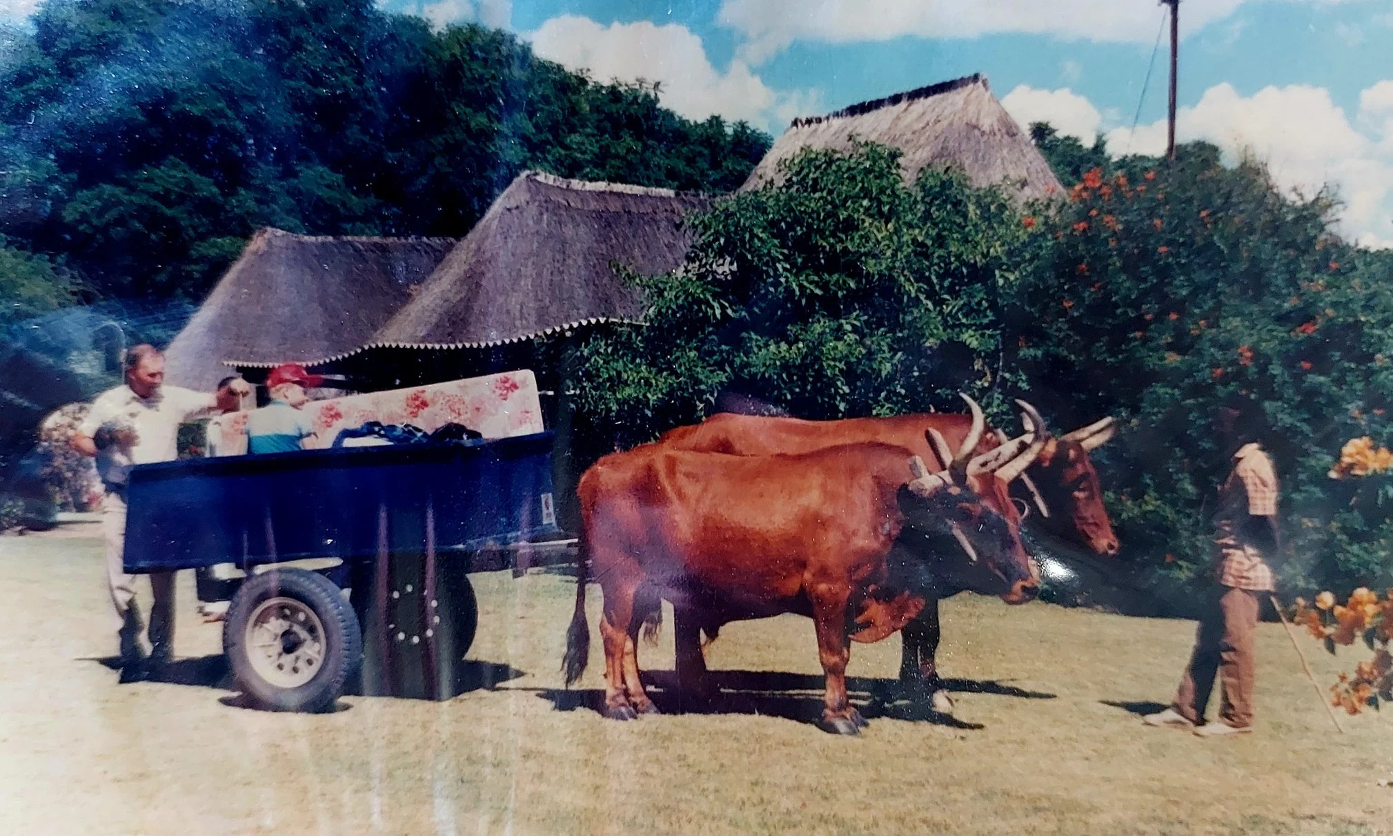 Image: Supplied. Jack as a child with his family in a bullock wagon in Zimbabwe.